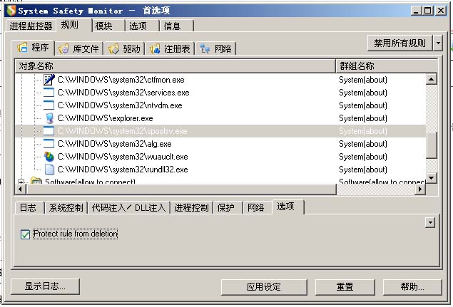 第一步显示:那4个红色的病毒进程————SSM结束不了(SSM默认显示将规则禁止但不能结束的进程显示为红色)。