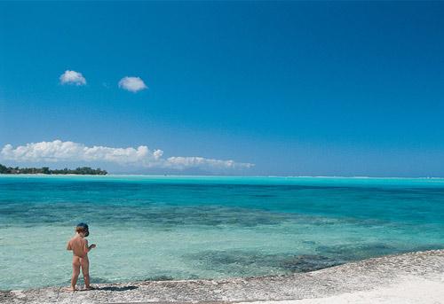 一个光着身子的小男孩站在法国波利尼西亚南太平洋玉蓝色的大海边。这里是欧洲旅行者眼中的人间天堂。