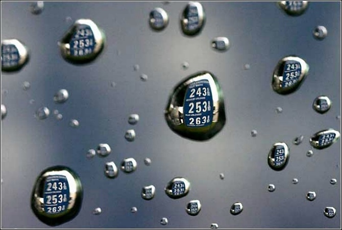雨滴下落,但不是价格下落:3月22日,美国California圣弗朗西斯科的加油站,汽油的价格映在雨滴上。此前的两周,汽油价格上升幅度超过12美分,创下新高,达到每加仑2.13美元。