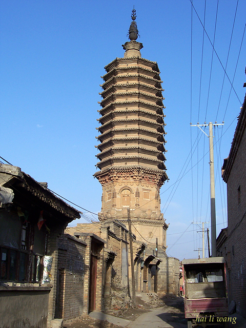南安寺塔位于蔚县城南西侧。一说,始建于北魏佛都盛行时期,重修于辽;另据康熙四十五年《古南安寺修塔宝记》载,“蔚萝南安寺塔自汉始也,未有城已兹塔。”可见其年代久远。但据其结构造型分析,现存为一座辽塔。该塔为一座8面13级实心密檐砖塔,因坐落在南安寺,故名南安寺塔。后寺毁塔存,塔名仍沿旧称。塔高28米,塔基为石条叠砌而成,塔身置于莲花座之上。塔身第一层较高,各隅皆有塔柱,四周相间设拱形隔扇门与小窗,顶部雕盘龙,盘龙之上又有砖斗拱。二层以上变低。各层都悬有铁马,微风吹过,叮咚有声。塔顶雕饰莲花,承托刹身。此塔上下浑然一体,巍峨矗立, 宛如一幢造型精美、典雅庄重的阁楼。为国家级重点文物保护单位