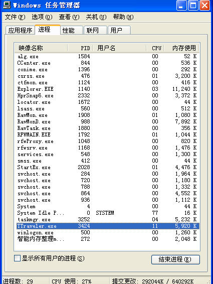 没 我是XP系统的。。。因为要发进程里的图,所以在800X600的分辨率下截取不了全部进程,所以只能把任务管理器的边框都取消掉才可以截取全部进程
