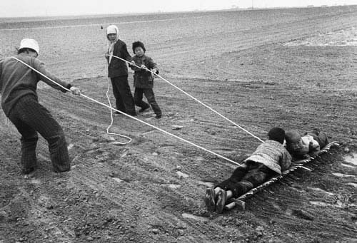 为了帮助平整土地,孩子的身体都撂到排子上
