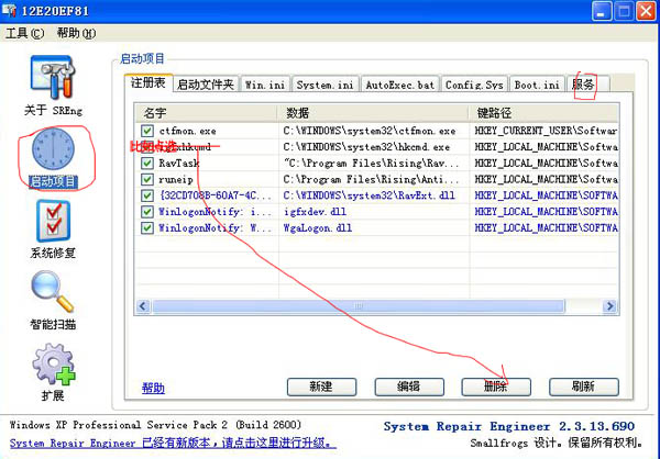 运行SREng-在"启动项目->服务->"Win32服务应用程序"选中"隐藏已认证的微软服务" 然后将下面名称的服务删除(选中有问题的服务后,点“删除服务”,点“设置”按钮即可。 注意弹出的窗口中要点 “NO 否”才是确认删除服务)(不能删除的就禁用:启动类型改为disabled,点中修改启动类型,点设置):