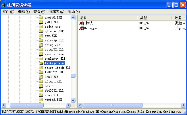 病毒创建N个这样的劫持项,键名分别是杀软、防火墙、常用杀毒工具的.exe。中毒后,凡是运行这些杀软、防火墙以及手工杀毒常用工具时,均执行Debugger键值指向的病毒程序。