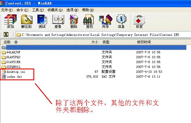 可用WinRAR打开:C:\Documents and Settings\Administrator\Local Settings\Temporary Internet Files\Content.IE5文件夹删除除了图中的所示的文件,其他都删除。