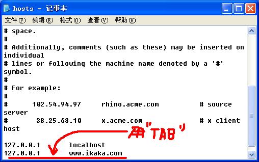 图5:进入HOSTS的内容后,将光标定位到已有内容的下一行(不可接着原有内容打),输入127.0.0.1+你想屏蔽的网站地址(如我图中填入的新内容,则表示屏蔽了卡卡论坛),然后保存退出。