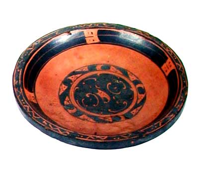彩绘变形鸟纹圆盘 (口径18.3,高2.8cm) 木胎,旋制。敞口,宽平沿外折,弧形壁,平底。器内底髹两圈红漆,余髹黑漆,内底正中的黑漆地上用红、灰黑无光漆绘鸟云纹、变形鸟纹、卷云纹、圆卷纹,第二圈用红漆绘变形鸟纹,口沿内外绘变形鸟头纹,口沿上绘波折纹、点纹。外底有烙印文字。