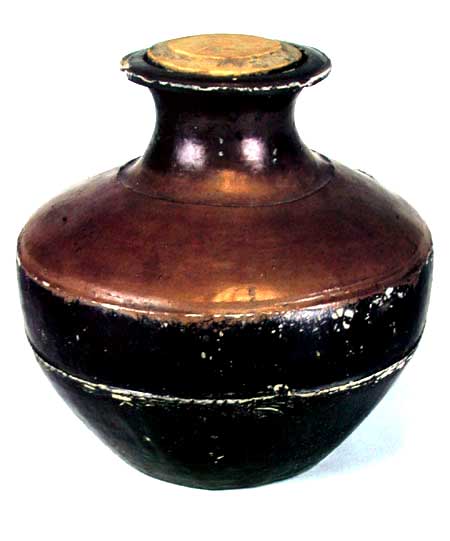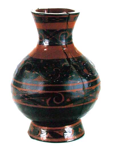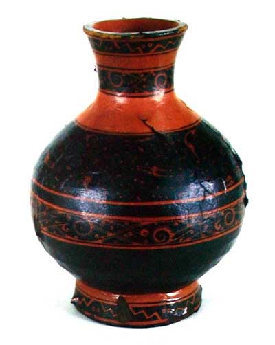 彩绘变形鸟纹壶 (口径11.6,最大腹径21.9,通高32cm) 木胎,旋制。由两半边粘合而成。敞口,束颈,大圆鼓腹,圈足。器内髹红漆,器外髹黑漆。颈、腹、圈足上有用红漆绘的宽窄不同的8道带纹,口沿外用红漆绘变形鸟头纹、点纹,颈、中腹用红、褐漆绘变形鸟纹、圆卷纹、菱形纹等纹样,上腹用红、灰黑无光漆绘变形鸟纹、鸟云纹、圆卷纹、点纹和变形鸟头纹等图案,圈足上用红漆绘变形鸟纹。