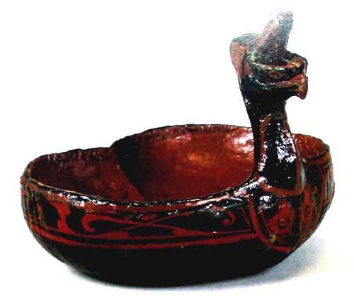 彩绘凤形勺 (勺高4,通高10cm) 木胎,挖制辅以雕制。以凤的首颈为把,凤身挖制成勺,无尾,平底。勺里髹红漆,余髹黑漆,并用红、褐漆彩绘凤的眼、嘴、羽毛纹,以及变形鸟纹等纹样。外底有“郑亭”烙印文字。