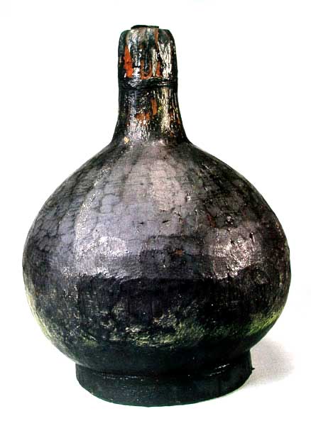细颈壶 (口径4.2,圈足径16.2,通高31.4cm) 木胎,斫制。两半边相粘合。小口,细颈的上部作蒜瓣状,球形腹,平底,矮圈足。口上有圆木塞,木塞直径2.7、厚0.9厘米,颈部及圈足有麻绳缠成圆箍紧固,通体髹黑漆。素面。