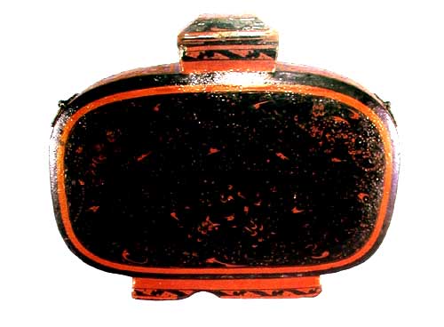 彩绘七豹大扁壶 (腹宽58,通高48cm) 木胎,挖制辅以斫制。器形特大,由两半边粘合而成,粘合痕尚可见。长方形口,短颈,肩上有对称的两个铜铺首衔环作系,盝状盖。器内髹红漆,器表髹黑漆,黑漆地上彩绘花纹。口沿外和圈足上红漆绘变形鸟纹;两侧腹为红、褐漆绘鸟云纹、鸟头纹、卷云纹;正、背面各绘神豹三只,即正面中下部绘一飞豹,左右各绘一神豹,三豹之间绘鸟纹、鸟云纹、圆卷纹;背面三豹分绘于上部、中部和下部右侧,中部神豹张牙舞爪追捕一只似獐子的动物,三豹之间也填绘鸟纹、鸟云纹和圆卷纹等图案。盖顶中心绘一豹,四周绘鸟纹、鸟云纹、圆卷纹。七豹各具姿态,形象生动,线条勾勒交错,充分突出豹的特点,显得格外美观,是一件不可多得的西汉漆画艺术佳品。