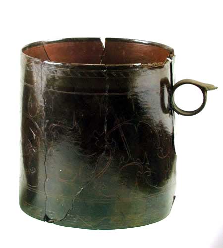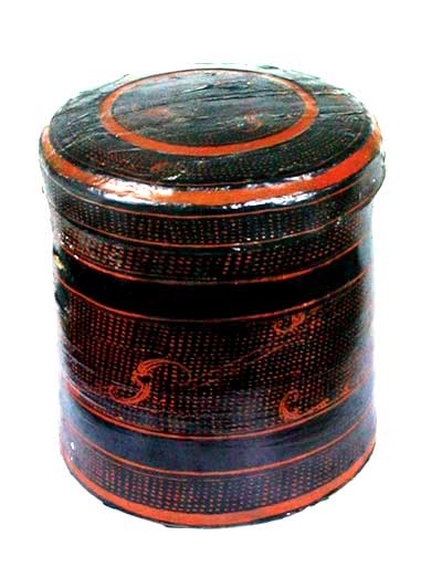 彩绘点纹卮 (口径20.5,通高22cm) 盖与底为厚木胎,斫制;盖沿与器壁为薄木胎,卷制。由盖与器身套合而成,整器为圆筒形。直口,直壁,平底,单环耳鋬(已失),盖顶隆起。器内髹红漆,器外髹黑漆,用红漆绘花纹。盖上与器外满饰点纹,其上又绘变形鸟纹。外底有烙印文字。