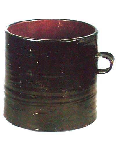 卮 (口径12.4,高11.4cm) 底为厚木胎,斫制;器壁为薄木胎,卷制。圆筒形,直口,直壁,平底,单环耳鋬,器里髹红漆,器外髹黑漆。素面。