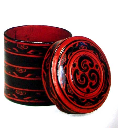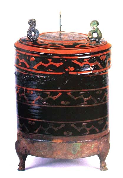 彩绘双龙纹樽 (口径10.8,盖径12.5,通高19cm) 盖、底为厚木胎,斫制;盖壁与器壁为薄木胎,卷制。由盖与器身套合而成,整器呈圆筒状。直口,直壁,平底,腹外有单环耳鋬,近底部有道铜箍并安三铜蹄足,盖顶隆起,并饰三个S形铜钮饰。器内髹红漆,器表髹黑漆。并在黑漆地上用红、褐漆彩绘花纹:盖顶中部绘双龙纹间变形鸟头纹,周边饰波折纹、圆点纹,器身外壁有三圈波折纹、点纹、圆卷纹。