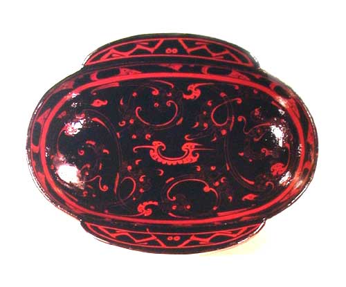 彩绘双凤纹耳杯 (长21,宽15.5,高6cm) 木胎,挖制。椭圆形,新月形耳,平底。通体髹黑漆,井用红漆绘花纹:口沿内为变形鸟纹,口沿外及耳上为波折纹、圆圈纹,内底绘两只凤鸟,翱翔于云纹之中。凤鸟以涡纹为羽,卷云纹为足,想象丰富,排比匀称,画面生动;内底中心及四周各绘一只变形鸟纹,使画面气氛更为热烈。外底还有烙印文字。