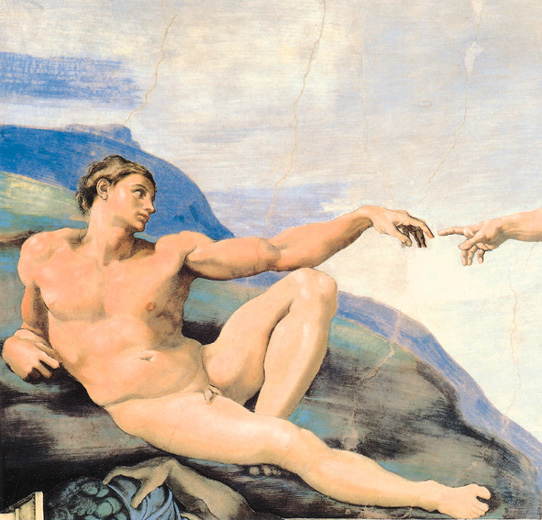 取材自《圣经》中的上帝创造世界的传说。上帝创造的人类始祖亚当,被画家描绘为体格健美的青年,充满了现世人物