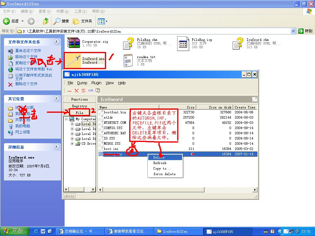 建议用操作系统安装光盘引导格式化C盘重装系统(你的机病毒太多了,手工操作很麻烦),重装完毕后上网到我的网盘(地址见签名)下栽ICESWORD1.22到桌面上,运行ICESWORD.EXE,删除以下隐藏文件(方法如图,英文版本的,解释下),然后重启电脑: