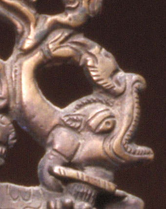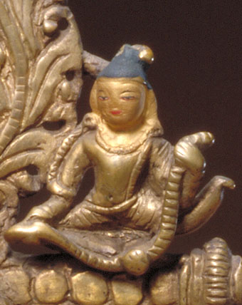 造像铜质,黑红光润,表面工艺精细,外形及装饰细部模仿克什米尔像。菩萨面庞消瘦,戴三角冠叶珠宝冠,长辫披肩,右手施无畏印,左手握莲花茎。左肩搭羊皮,身材细长,姿态僵硬,虽缺少克什米尔像肌腱发达粗壮有力的特点,但已开始显露早期西藏佛像的朴拙神韵。