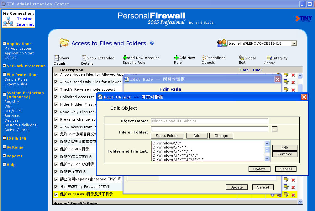 注意:这种设置,WINDOWS打补丁时(访问微软网站),应临时关闭Tiny的windows security。