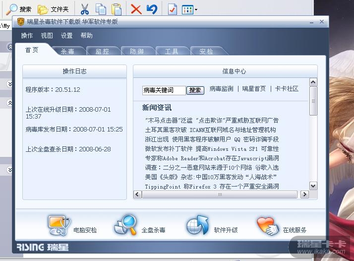 呀~~~没有吧,我前段时间也用瑞星查杀过病毒,(可是我用其它的软件如;360,金山清理专家,NOD32都没查出来,而且感觉NOD32可能已经被病毒修改了,所以,我是卸了之后才安装的瑞星2008下载版的)就是那个一键还原精灵,