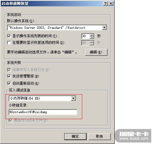 1、右键单击“我的电脑”,选择“属性”,单击“高级”选项卡,选择“启动和故障恢复”下面的“设置”,将“写入调试信息”设置为“小内存转储”