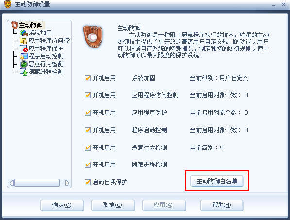 这种情况的出现有很多种可能,有程序要动瑞星可能是正常的程序,也可能是病毒程序,还有可能是病毒注入到了正常的程序中。如果认为触发的文件没有问题,可以加入到“主动防御白名单”里,这样下次就不会再提示的。但是同样的,瑞星就对这个程序没有了防备,如果把病毒添加进去了,肯定会对瑞星、系统有影响。如图: