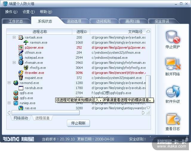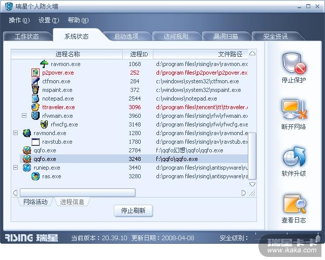 1、瑞星卡卡的高级功能-->进程管理中检测不到它的进程。(qqffo.exe进程)