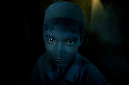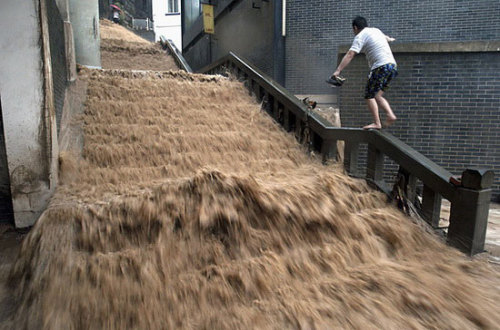 7月,中国重庆市暴雨引发洪水。洪水冲下台阶,男子只能爬上扶手。