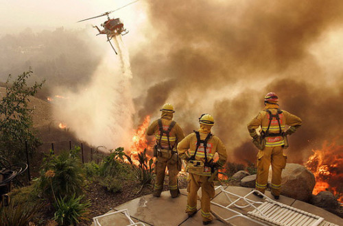 加利福尼亚,消防员们看直升机灭火。10月,一系列的山火摧毁了50万英亩山林,迫使成千上万居民疏散。