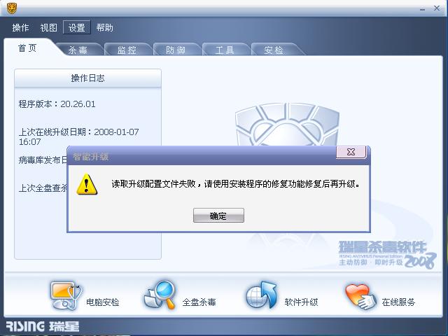 我用的是瑞星07版的正版杀毒软件,刚按上时一切正常,也能升级