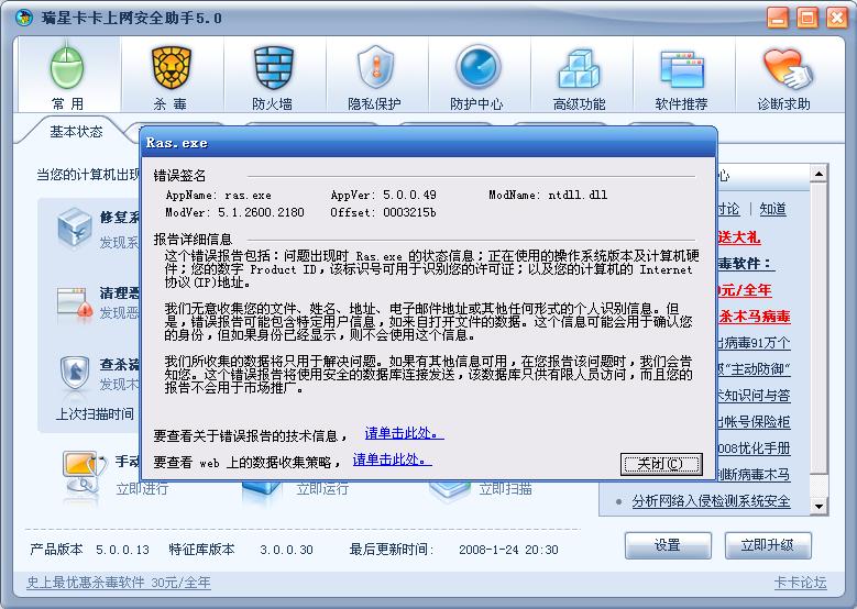每次打开都会显示ras.exe遇到问题,发送错误报告。一出现这个卡卡助手上的东西都无法点击了,无法使用了。然后我点不发送错误报告,卡卡就关闭了.....