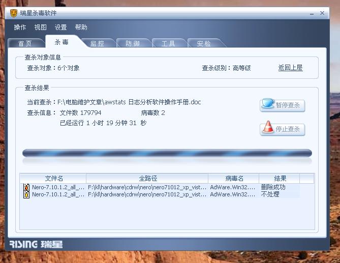 事情经过:好几天前我又重新下载了nero7升级文件,文件存放在我的硬盘F盘上,因为好几天没有杀过毒了,前天运行瑞星2008全盘杀毒,结果还是从nero7升级文件里杀出了两个病毒,一个说已经删除成功,另一个要我处理。我做了不处理的动作。杀完毒后我没有把这文件删除,仍旧存放在原来位置。今天我又运行了瑞星2008全盘杀毒(已经升级到最新版),结果又在nero7升级文件中杀毒了同样的病毒,一个说删除成功,另一个要让我处理。同样的文件被杀了两次,两次都说清除成功?我真不知道,瑞星到底是处理了这个病毒还是骗骗我们用户说杀除了,如果不是我忘了把那个给瑞星杀出病毒的nero7升级文件删除还不会发现这个问题。现在我很担心,这个瑞星每次报的杀除病毒是真杀除了还是没有杀除呢?