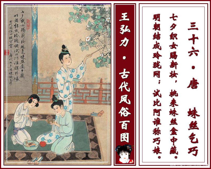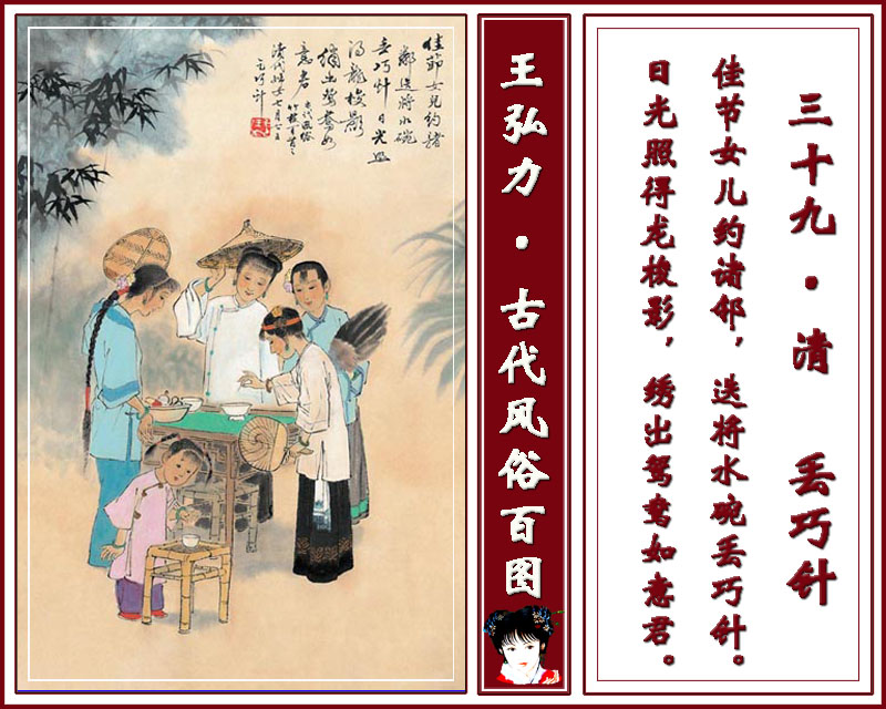 三十九 清 丢巧针 佳节女儿约诸邻,迭将水碗丢巧针。日光照得龙梭影,绣出鸳鸯如意君。