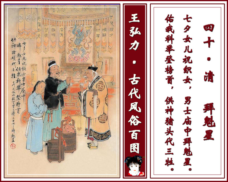 四十 清 拜魁星 七夕女儿祝织女,男士庙中拜魁星。佑我科举登榜首,供神猪头代三牲。