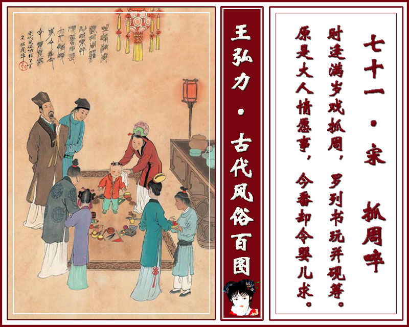 七十一 宋 抓周啐 时逢满岁戏抓周,罗列书玩并砚筹。原是大人情愿事,今番却令婴儿求。