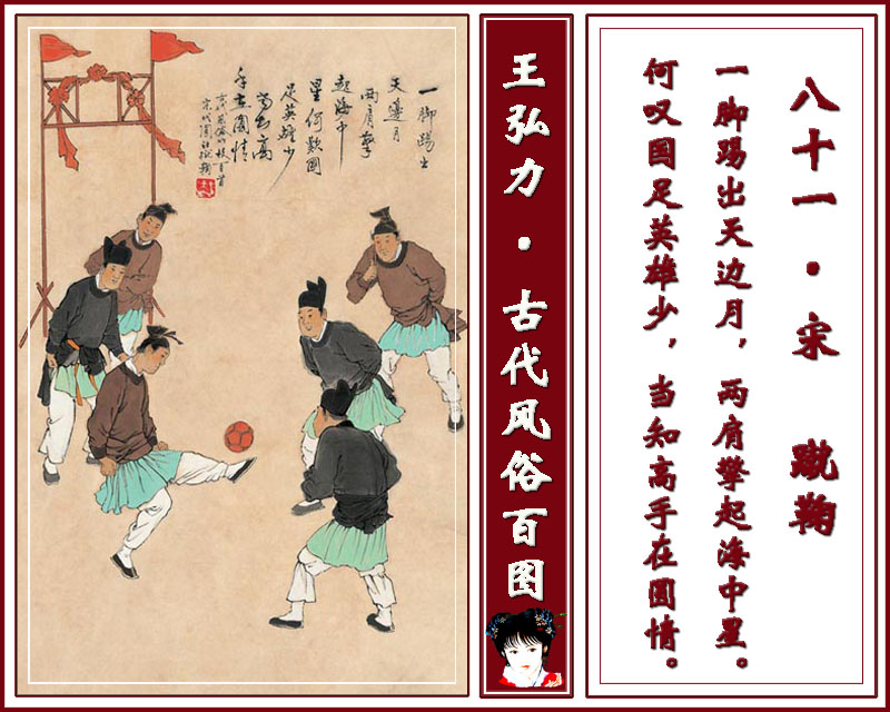 八十一 宋 蹴鞠 一脚踢出天边月,两肩擎起海中星。何叹国足英雄少,当知高手在圆情。
