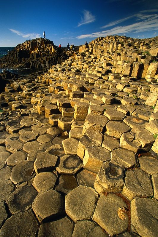 位于北爱尔兰贝尔法斯特西北约80公里处大西洋的贾恩茨考斯韦海岸110米的断崖上,可见无数石柱突起。总长8公里的海岸线上呈正六角形,共计4万根的石柱由陆地向海里绵绵延伸。其景观有似巨人所造,固有“巨人古道”之美称。是6000万年前太古时代火山喷发后熔岩冷却凝固而形成的。如此排列有序的石柱,不禁让人怀疑不是天然雕琢而是人工有意堆积而成的。1986年被认定为世界遗产