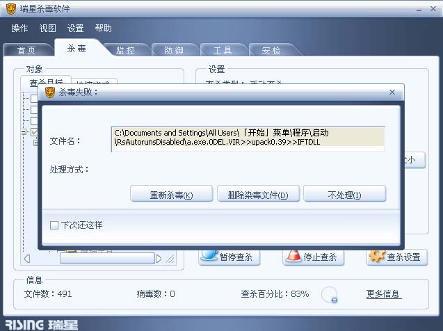或者先用瑞星的主动防御禁止启动文件夹里创建文件、读取文件、访问等。