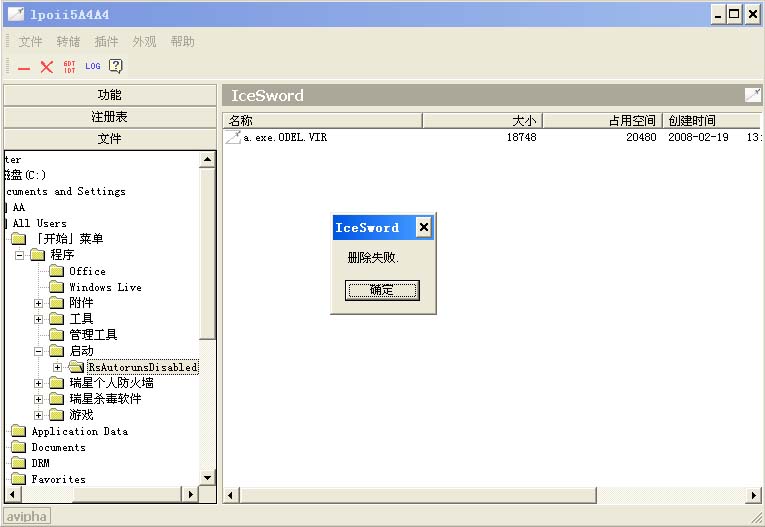 用瑞星主动防御禁了那个文件,可是用冰刃强制删除那文件外的那个文件夹仍然不成!!!!无奈了~~~~~~~~~~~