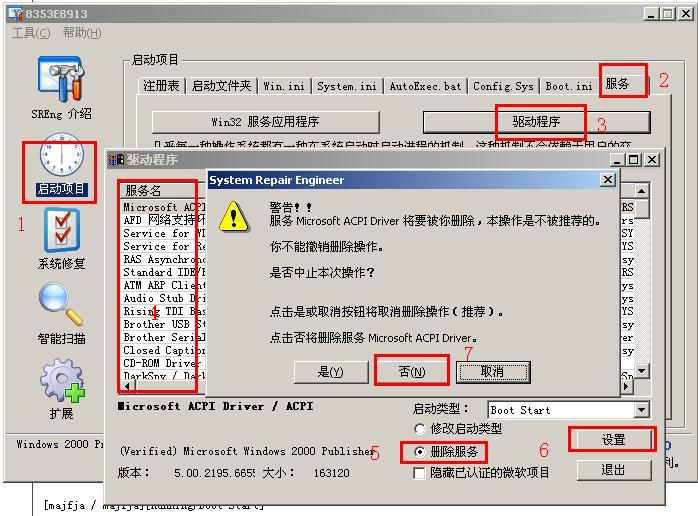 天月大虾大哥,我不明白怎么操作,我进去后,启动项目》服务》驱动程序》里面找到第一个:[RAS Asynchronous Media Driver / AsyncMac][Stopped/Auto Start],可是怎么删除呀,是不是要点“删除服务”然后点“退出”?