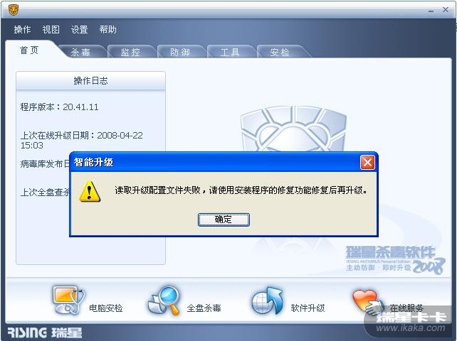 我的的杀毒软件一全盘杀毒就自动关闭了.升级也升不了!提示修复,怎么修复呀?