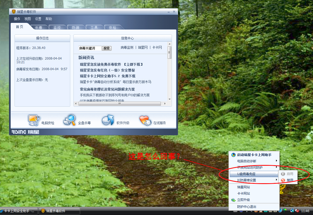 我安装的是“瑞星2008版”,那么卡卡的“u盘病毒免疫”应该自动关闭,但是我安装了瑞星每几天后,卡卡的“u盘病毒免疫”却启动了?用超级兔子和windows清理助手都没有扫出病毒和恶意插件。这是怎么回事?