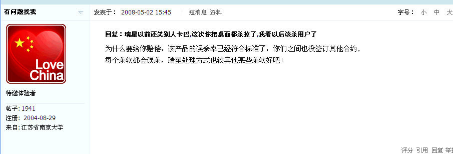 感谢瑞星的这次误杀,让我因此帮3个朋友重装系统而分别获得了两次下馆子一次唱K的酬劳咯。
