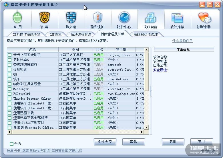 卡卡上网安全助手囊括智能广告拦截、系统修复、插件管理、插件免疫、系统清理、病毒疫情实时监测、信息搜索、病毒资料搜索、免费在线查毒等诸多功能,是您上网必备的辅助安全工具。