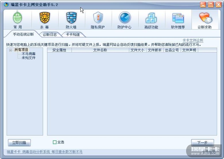 卡卡上网安全助手5提供手动在线诊断,帮您查看计算机上的木马病毒以及未知文件,您可以上报未知的可疑文件,以保证系统的安全。