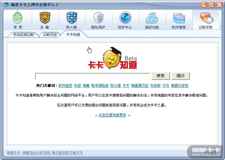 卡卡知道是帮助用户解决安全问题的网络平台,用户可以在其中搜索到问题的解决办法,并有瑞星的专家在其中解决疑难问题、在这里用户可以方便的提出问题或者回答问题,并有机会成为卡卡之星。