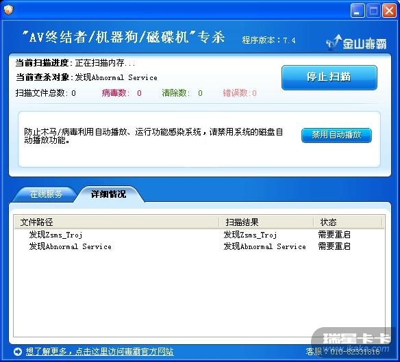 ② 用金山机器狗磁碟机AV终结者专杀工具7.4扫描的结果