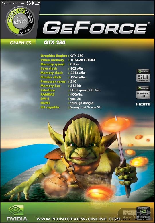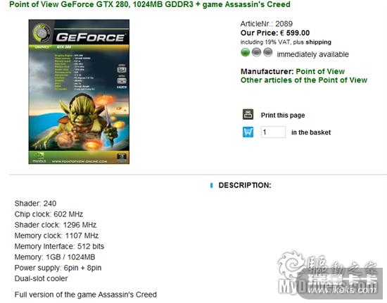 另外,欧洲显卡品牌Point Of View的公版GeForce GTX 280已经在网上开卖,要价599欧元(含税19%),折合人民币约6340元