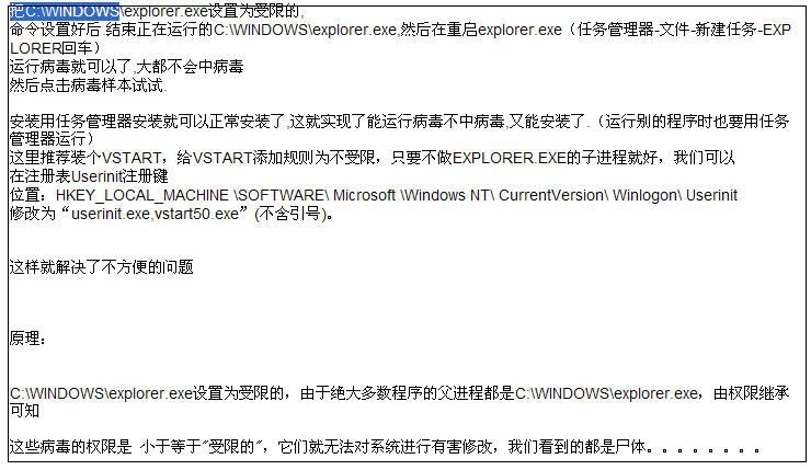 将explorer设为受限,严重限制了自己,却免不了中毒。你双击病毒样本确实不会中毒,因为但凡双击其父进程都是explorer,但是网马可不是explorer启动,多分是iexplorer启动。由于受限的不能启动子进程,你只好用任务管理器启动iexplorer,此时iexplorer的父进程是taskmgr.exe,继承的是任务管理器的权限。所以你仍然会中毒,只是限制了自己而已。