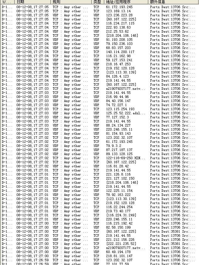不知道是不是跟这个黑客有仇 从昨天下午开始就被攻击无数次 先前只是网络中断 没有觉察到什么 当时我用的防火墙是瑞星+卡卡助手+AVG7.5+驱逐舰 都没有异常情况 但是网络连接正常 就是不能进行网络活动 如果打开网页回显示"该页无法显示" 所以我就用各种杀毒软件杀毒 先用瑞星 再用AVG 然后是驱逐舰 都查出了一些病毒 但好象和这个没有关系 所以我就用系统还原 用了2次都只好了一会 我就怀疑是被人攻击了 利用能上网的1点时间 我去百度搜索"最好的防火墙" 就下载了ZA 有提示IPXX.XX.XX.XX 访问我的计算机被拒绝 系统是正常一会了 但是好景不长 (这个黑客真是个高手) 晚上再度出现类似情况 我做了第三次还原 这次下载的是looknstop 开启以后真是吓了1跳 N个IP冲过来.... 我真是不知道该怎么办 不知道这种情况能不能报警